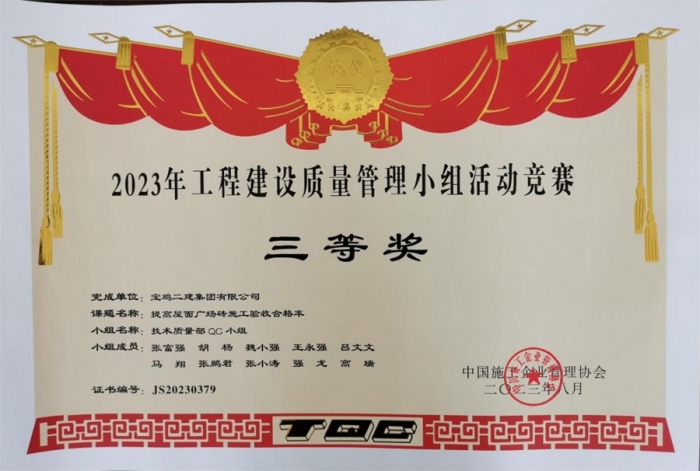 最終,碧水潤園QC小組“提高衛(wèi)生間反坎一次驗(yàn)收合格率”榮獲2023年工程建設(shè)質(zhì)量管理小組活動競賽一等獎,技術(shù)質(zhì)量部QC小組“提高屋面廣場磚施工驗(yàn)收合格率”榮獲2023年工程建設(shè)質(zhì)量管理小組活動競賽三等獎,明星QC小組“高層泵管清洗水處理技術(shù)創(chuàng)新”榮獲2023年工程建設(shè)質(zhì)量管理小組活動競賽三等獎。